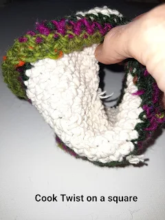 Below is a photo of a different Noble Shape made by the same Cook Twist. The middle photo is a Noble Shape with justeleven stitches of blue on Row 4. (Row 0 is dark green).